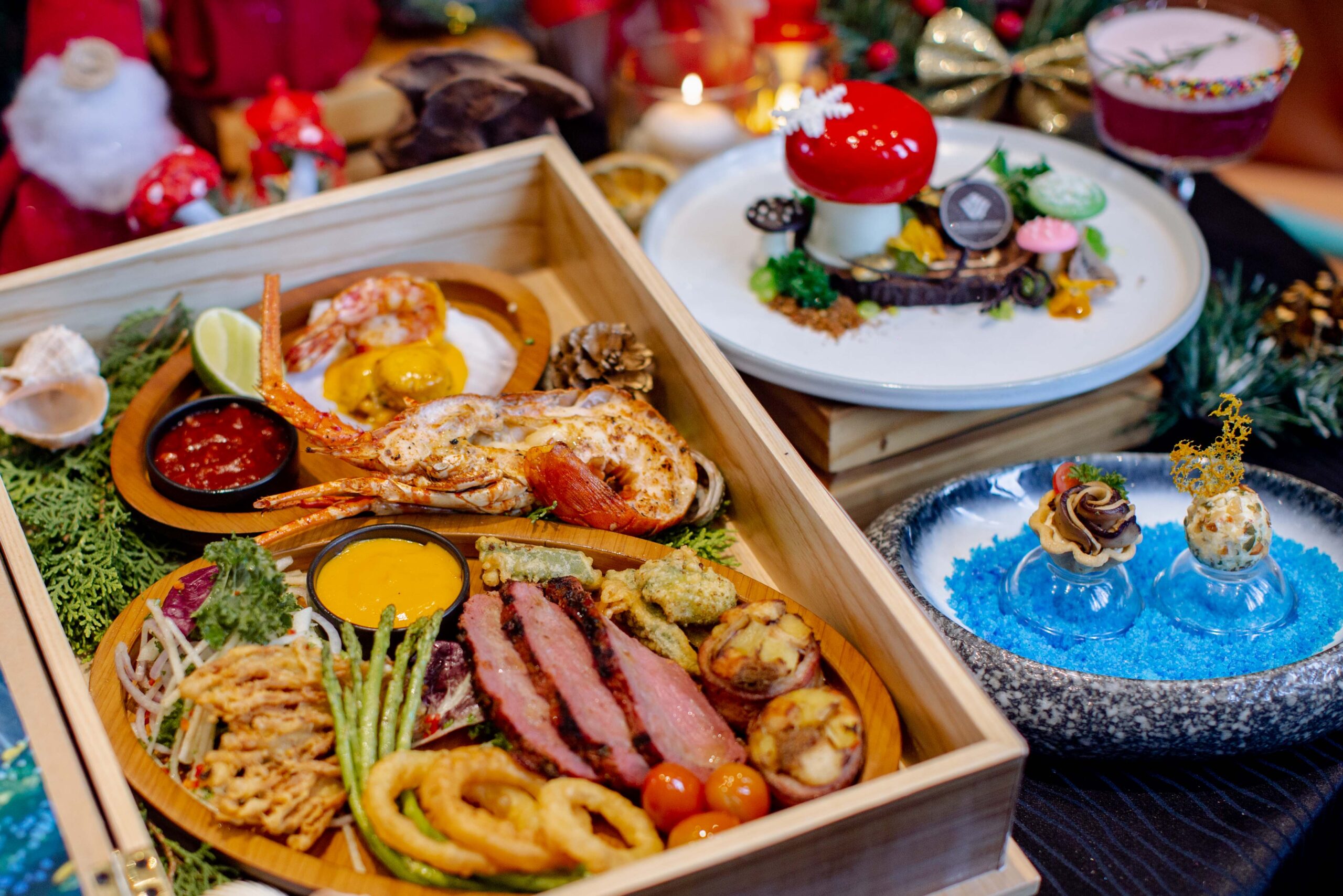 – Surf & Turf, trải nghiệm khay ẩm thực kết hợp hải sản và thịt đỏ cao cấp gồm tôm hùm và bò nướng